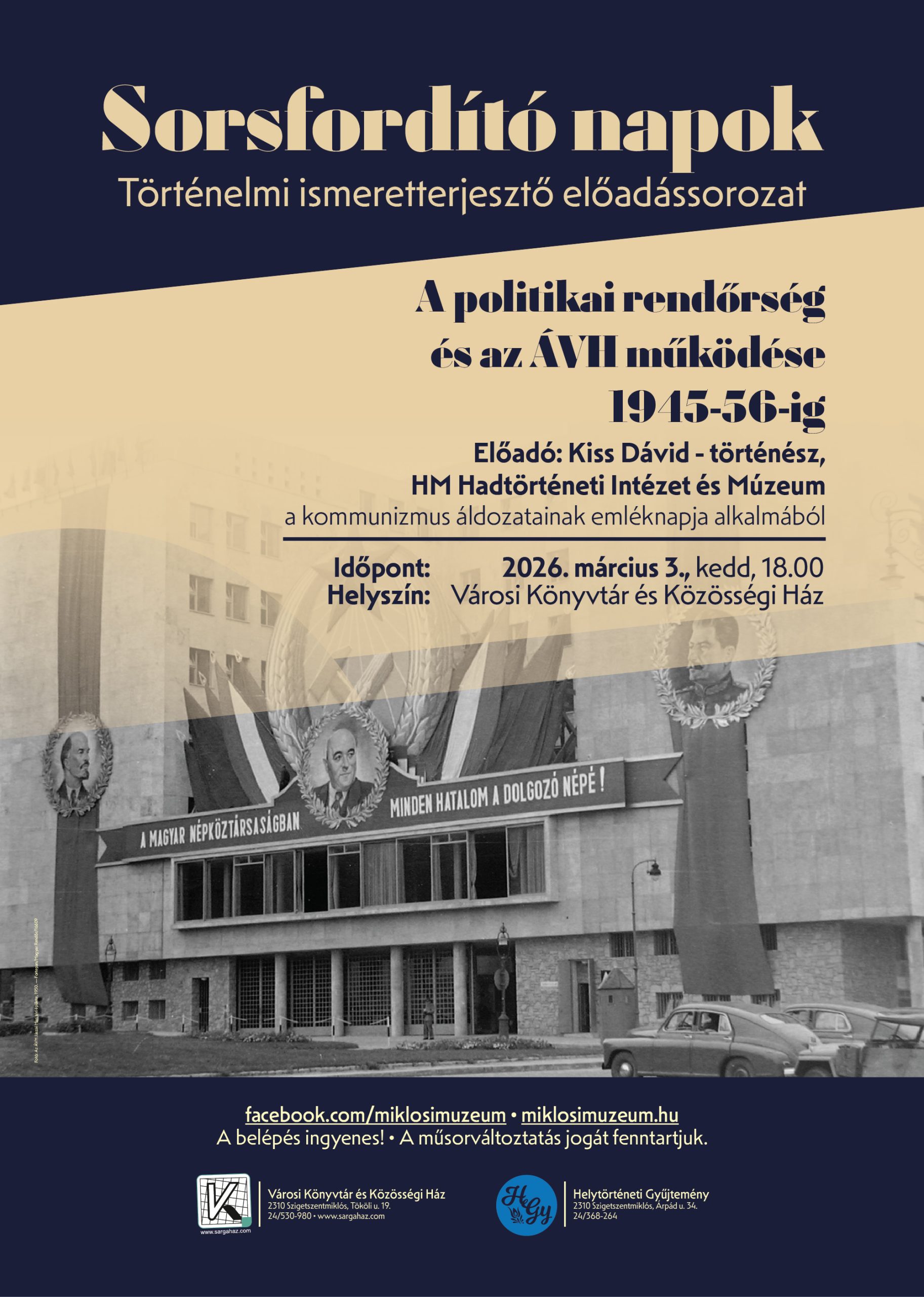 A kommunista diktatúrák áldozatainak emléknapján történelmünk egyik legsötétebb időszakára tekintünk vissza, amikor a szovjet megszállókkal a háttérben a kiépülő diktatúra fokozatosan leépítette az éppcsak kibontakozó magyar demokráciát. Hogyan épült ki a karhatalom Magyarországon 1945 után? Milyen eszközökkel tudták a pártokat elfojtani, képviselőiket bebörtönözni? Hogyan jött létre a hírhedt ÁVH, melynek pribékjei rettegésben tartottak mindenkit? Sorsfordító Napok című előadássorozatunk keretében ezekre a kérdésekre ad majd választ Kiss Dávid, a HM Hadtörténeti Intézet és Múzeum történésze, akinek kutatási területe az államvédelem története, a megfigyelés módszerei.